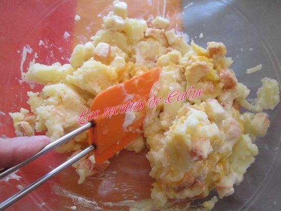 Dans un saladier, mettre la purée refroidie, le beurre ramolli, la crème fraîche, le fromage en petits bouts, les œufs. Travailler le tout à la spatule.