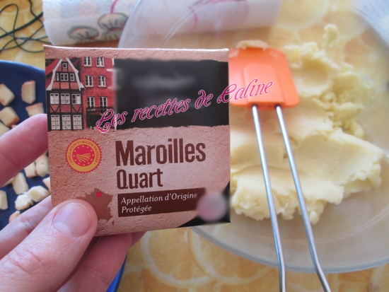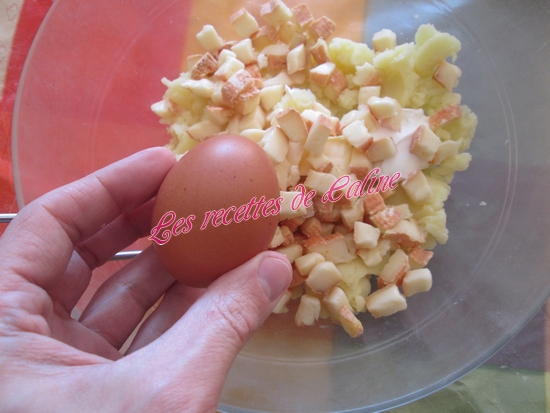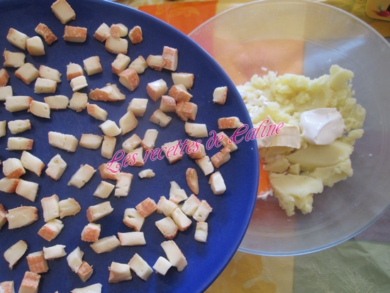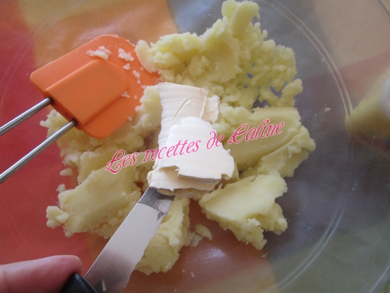 Dans un saladier, mettre la purée refroidie, le beurre ramolli, la crème fraîche, le fromage en petits bouts, les œufs. Travailler le tout à la spatule.