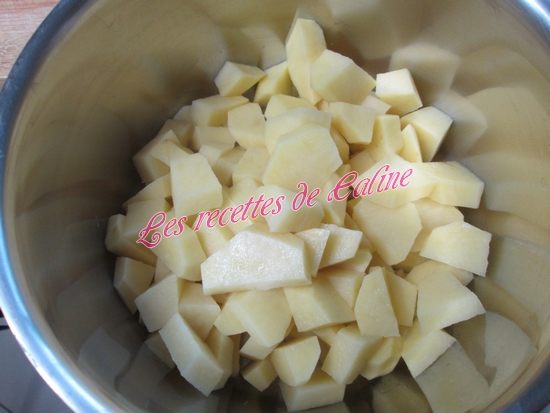 Faire cuire dans une casserole d’eau froide salée les pommes de terre épluchées et coupées en gros dés pendant 25 min à partir de l’ébullition. Les égoutter.