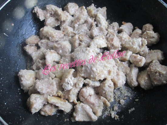 Couper le porc en dés, les fariner et les faire revenir dans une sauteuse avec 20 g de beurre quelques min. Saler et poivré. Réserver.