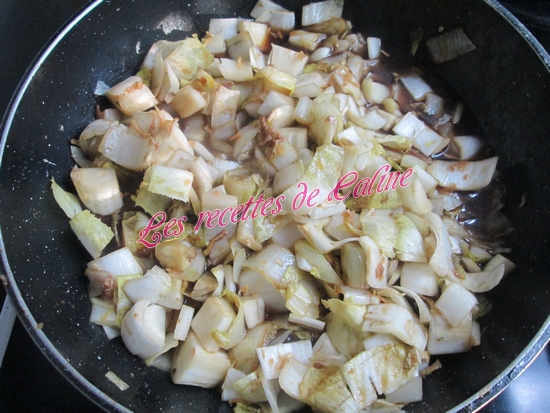 Dans la même sauteuse, mettre 1 cuil à soupe d’huile d’olive et y faire revenir les chicons émincés finement sans les coeurs et l’oignon, la cassonade, le soja, le laurier, du poivre et du sel. Réduire. Ajouter la bière et réduire à nouveau, remettre les endives, bien mélanger. Réserver. (Au moment de mettre la bière j’en ai gardé 15 cl pour faire la suite de la recette car mon homme ne mange pas de chicons et pour moi j’ai mis bière et eau pour avoir suffisamment de jus)