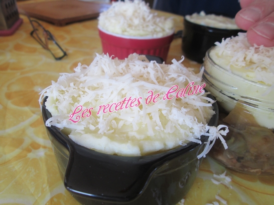 Dans des cocottes ou ramequins, remplir de préparation chicons/viande et mettre de la purée par dessus, ajouter un peu de gruyère râpé (la 1ere photo est la cocotte de mon homme).