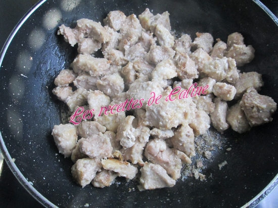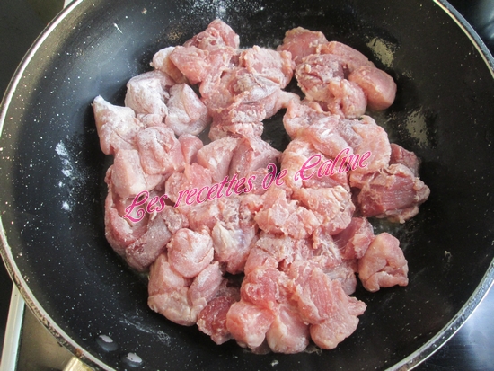 Couper le porc en dés, les fariner et les faire revenir dans une sauteuse avec 20 g de beurre quelques min. Saler et poivré. Réserver.