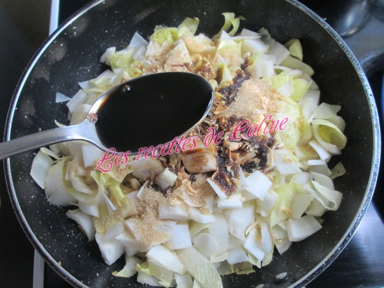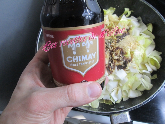 Dans la même sauteuse, mettre 1 cuil à soupe d’huile d’olive et y faire revenir les chicons émincés finement sans les coeurs et l’oignon, la cassonade, le soja, le laurier, du poivre et du sel. Réduire. Ajouter la bière et réduire à nouveau, remettre les endives, bien mélanger. Réserver. (Au moment de mettre la bière j’en ai gardé 15 cl pour faire la suite de la recette car mon homme ne mange pas de chicons et pour moi j’ai mis bière et eau pour avoir suffisamment de jus)