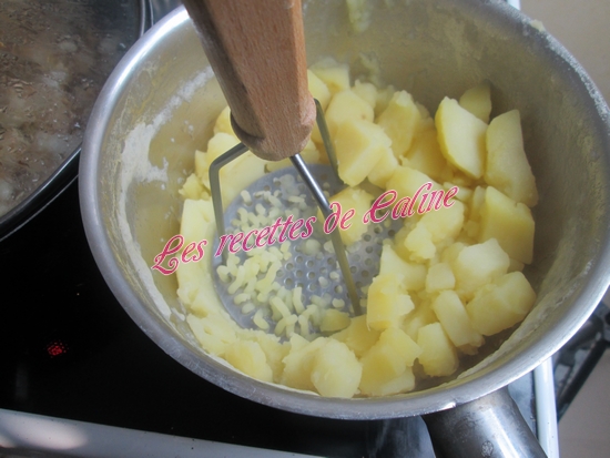 Faire cuire dans une casserole d’eau froide salée les pommes de terre épluchées et coupées en gros dés pendant 25 min à partir de l’ébullition. Les égoutter.