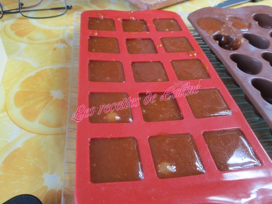 Remplissez le cadre, laissez reposer 1 heure, puis filmez (ou déposer une feuille de papier alu dessus sans la plaquer sur les caramels et réservez 1 heure au froid (oui ça fait long quand on est gourmand, mais ça vaut le coup d’attendre je vous assure)