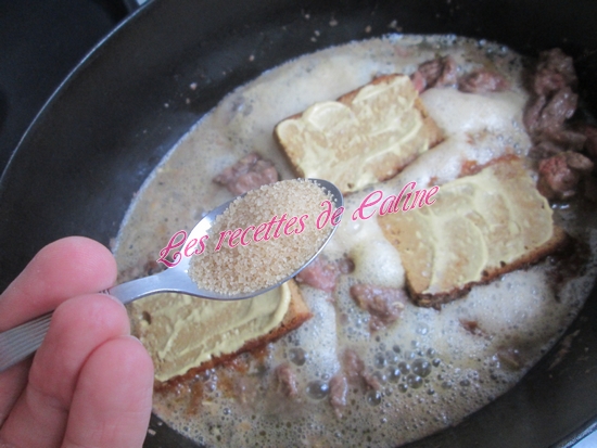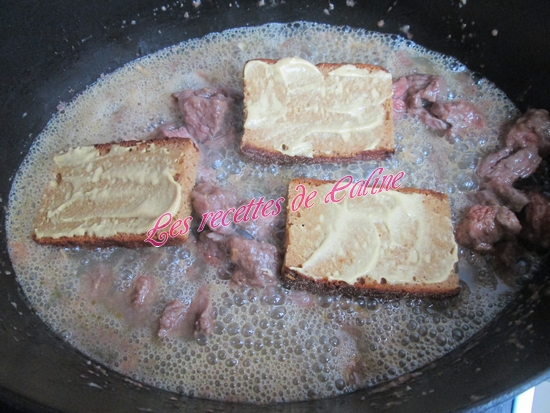 Ajouter l’Orangina, puis les tranches de pain d’épice tartinées de moutarde