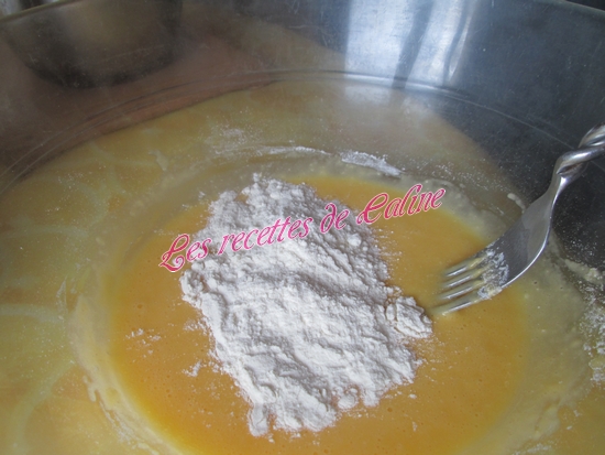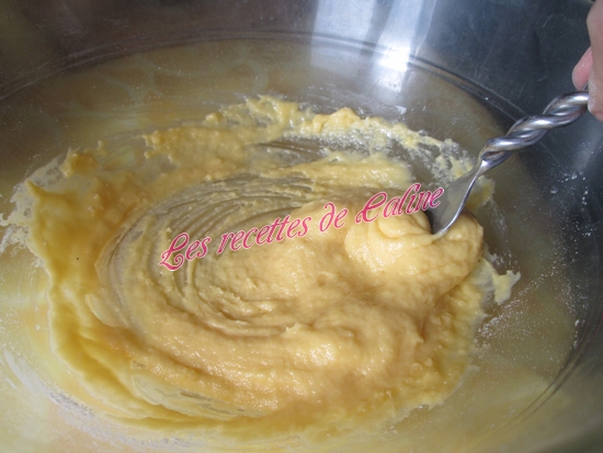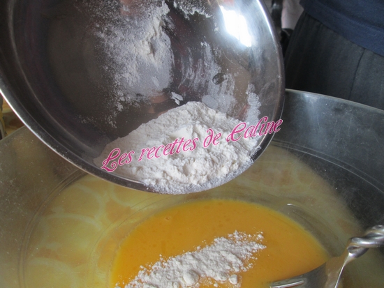 Ajouter les jaunes avec le beurre fondu, puis incorporer la farine en 2 fois et versez le lait en 2 ou 3 fois.