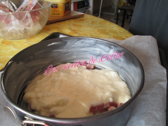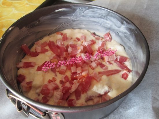 Répartir une parti des lardons au fond du moule beurré, , puis versez une parti du mélange aux oeufs par dessus, remettre une parti des lardons, mettre le reste de mélange aux oeufs et finir par le reste des lardons.