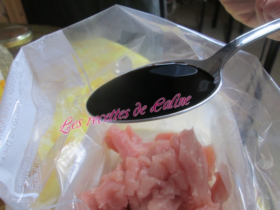Faites chauffer une poêle avec 1 cuil à soupe d’huile et y faire dorer les lamelles de poulet en les arrosant régulièrement avec la sauce.
