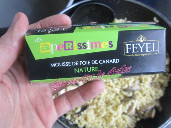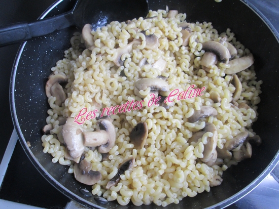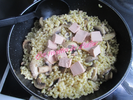 Couper la mousse de foie de canard en gros cubes et les mettre dans la poêle avec les pâtes et les champignons. Réserver