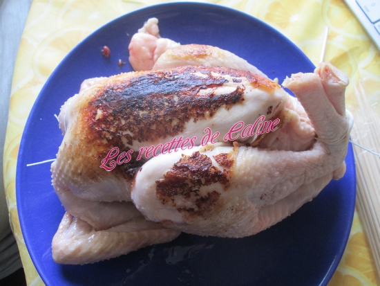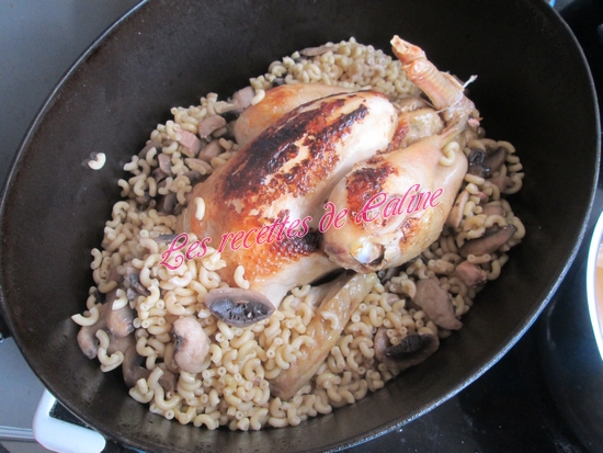 Le farcir avec les coquillettes à la mousse de canard, fermer comme vous pouvez le trou des fesses du poulet et le poser dans un plat à rôtir ou une cocotte en fonte, (Pour ma part, j’ai utilisé ma cocotte en fonte, et je l’ai fait cuire à couvert pendant 1 h 30 à 180°C (Th.6). Adaptez la température et la cuisson selon votre four et si vous le faites