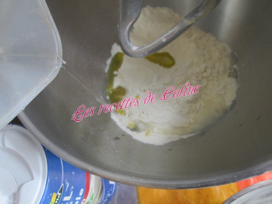 Dans un robot (ou un saladier), versez la levure dilué dans 1 cuil à soupe d’eau tiède, puis mettre la farine, le sel, l’eau, et l’huile, mélanger .