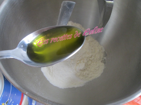 Dans un robot (ou un saladier), versez la levure dilué dans 1 cuil à soupe d’eau tiède, puis mettre la farine, le sel, l’eau, et l’huile, mélanger .