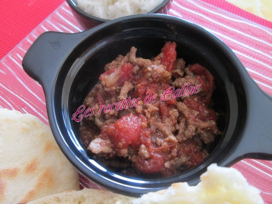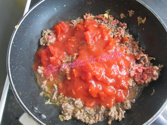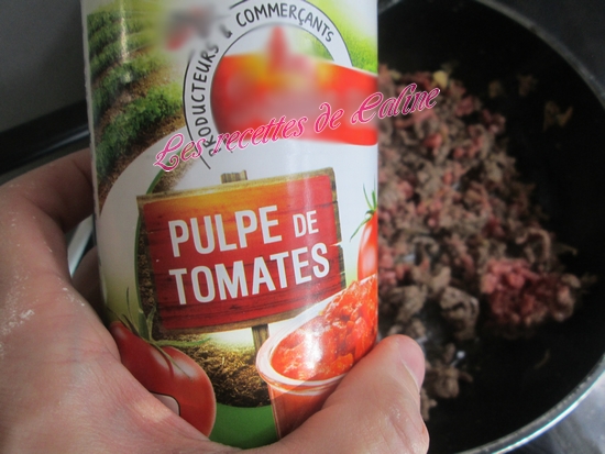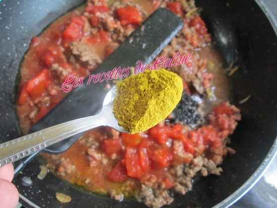 Ajoutez la viande hachée et la pulpe de tomates et le curry. Laissez mijoter pendant 20 min.