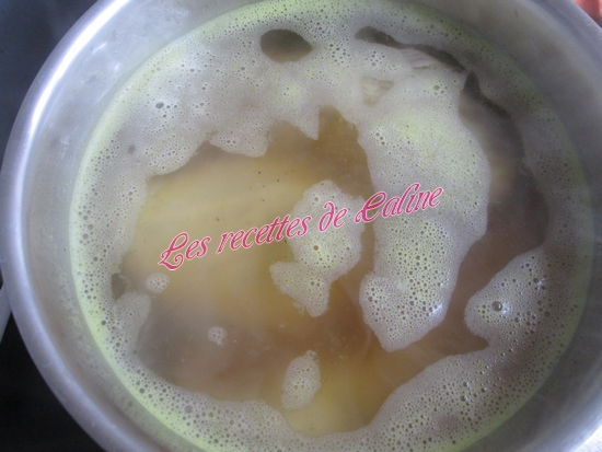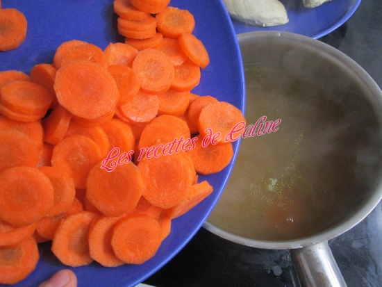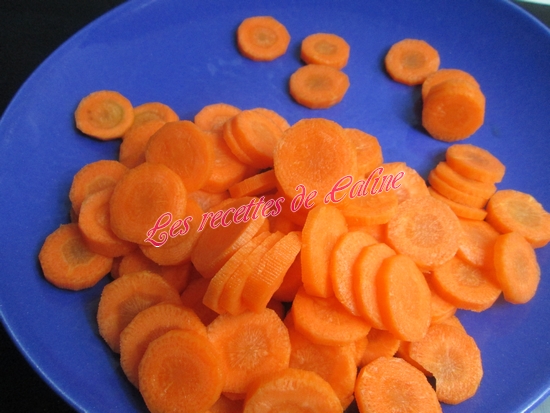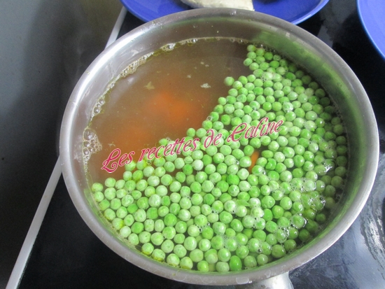 Eplucher et couper en fines rondelles les carottes, plongez-les avec les petits pois dans le bouillon de la viande, goûter une carottes pour voir si elles sont cuites,égoutter et réserver (On garde le bouillon)