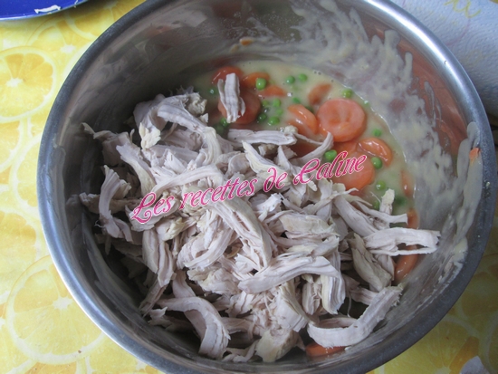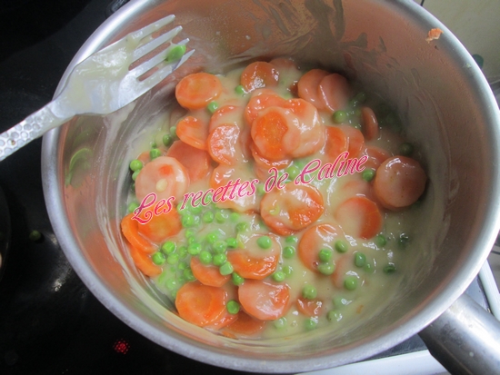 Versez les petits pois et les carottes dans la sauce, si vous voyez que la sauce est un peu épaisse, remettre un peu de bouillon
