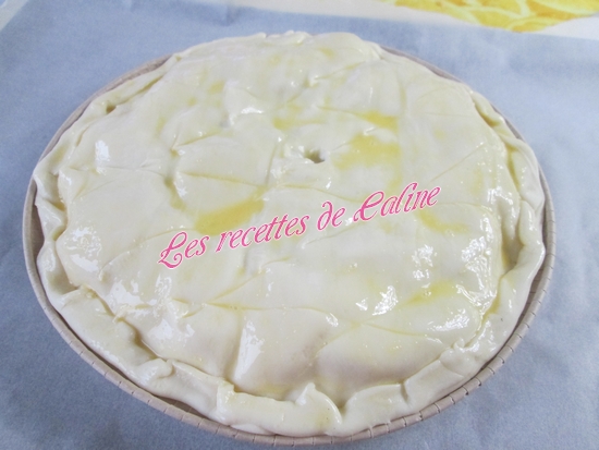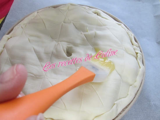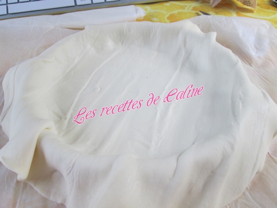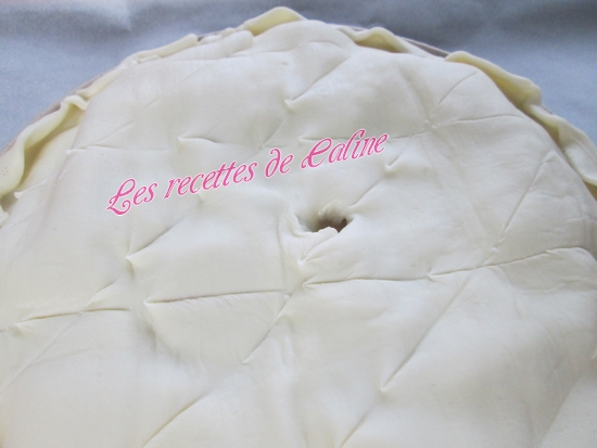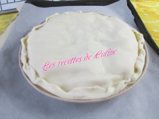 Déroulez la seconde pâte feuilletée sur le moule, en soudant bien les bords avec les doigts, la par contre, j’ai coupé un peu de pâte.