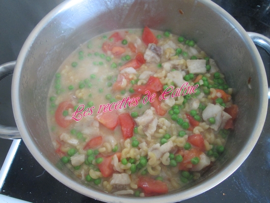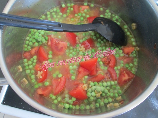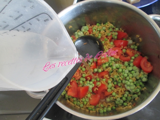 dés de tomates, les pâtes, les petits pois congelés et l’eau