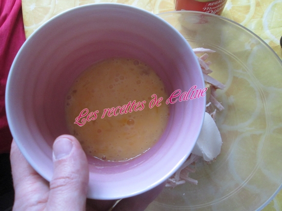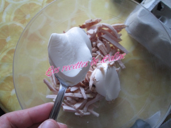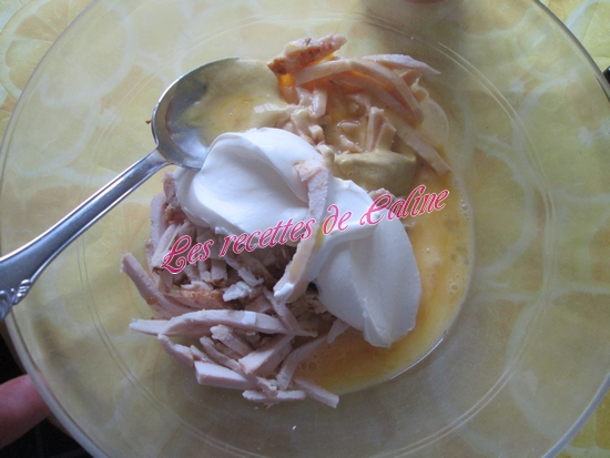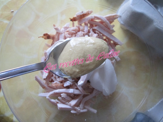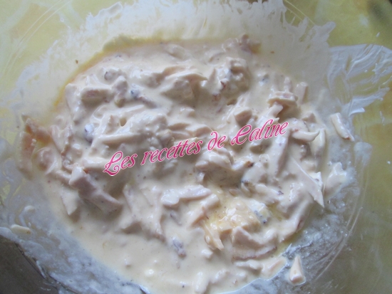 Effilocher le poulet ou le mixer grossièrement et le mélanger avec la crème, la moutarde et les 2 oeufs préalablement battus en omelette.