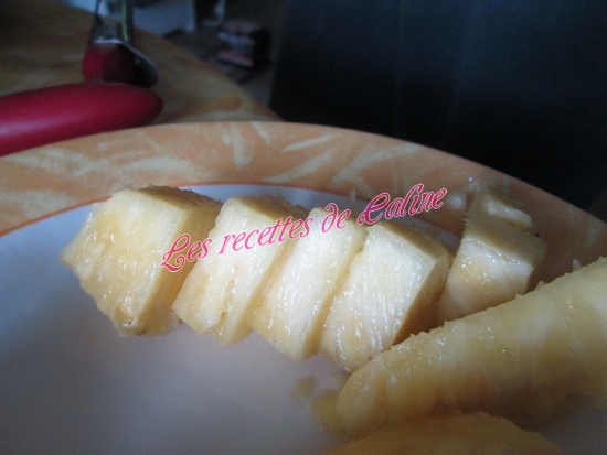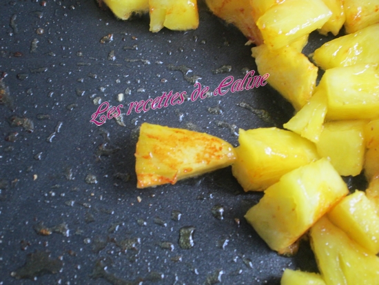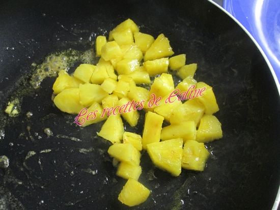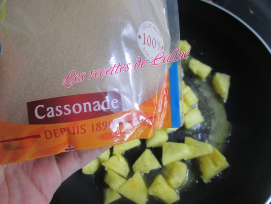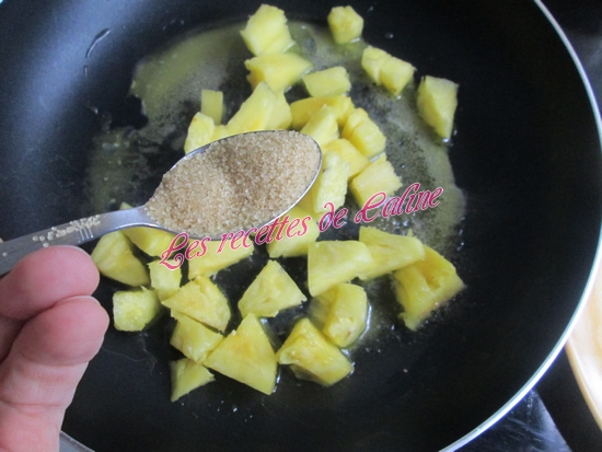 Couper l’ananas en brunoise. Faites-le revenir dans une poêle avec le beurre et le sucre roux. Réserver.