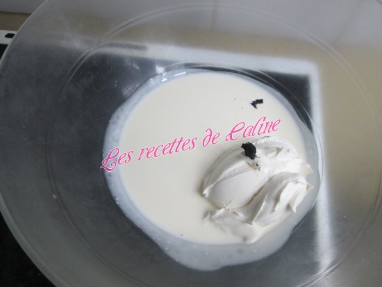 Monter la crème liquide avec le mascarpone, le sucre glace et la gousse de vanille grattée en chantilly. Réserver.