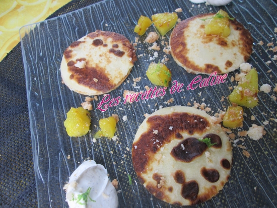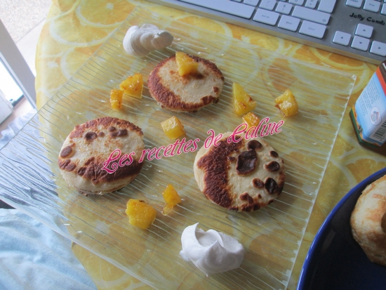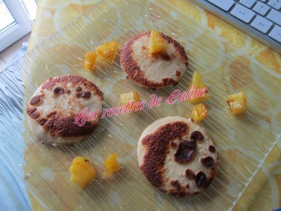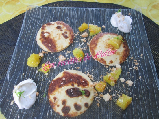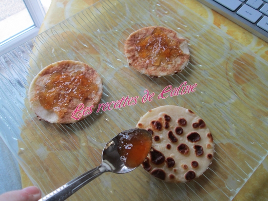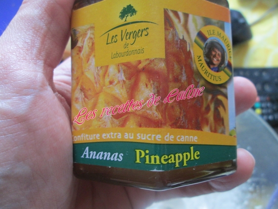 A l’aide d’un verre, faire des ronds de crêpes, sur chaque assiette, disposer 3 ronds de crêpes, étaler un peu de Confiture d’Ananas, refermer par un 2eme ronds.