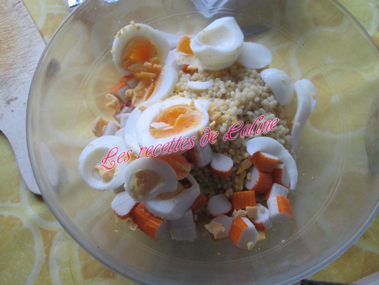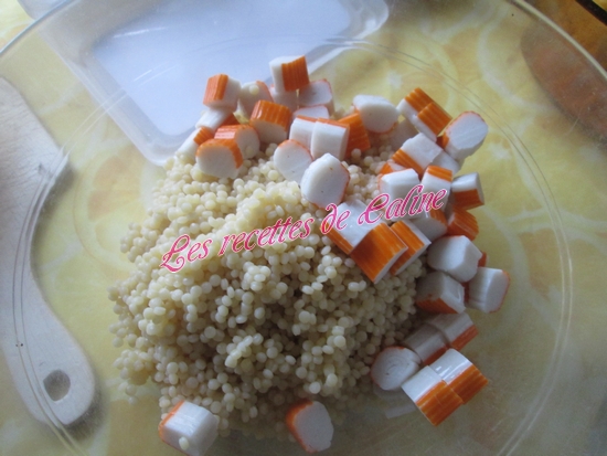 Coupez en petits tronçons les bâtonnets de surimi et les ajouter au saladier