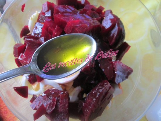 Coupez les betteraves en petits dés et les mettre aussi dans le saladier.