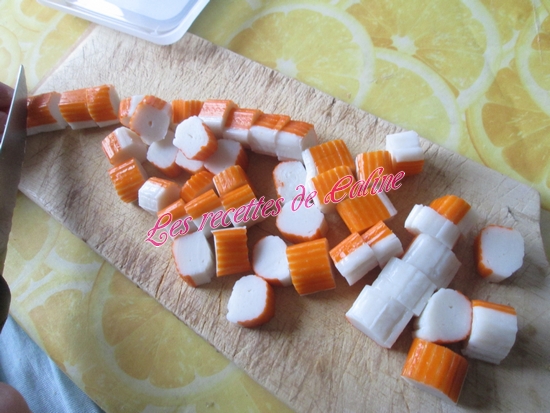 Coupez en petits tronçons les bâtonnets de surimi et les ajouter au saladier