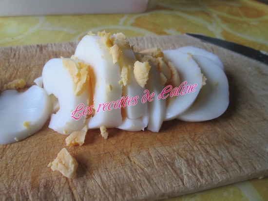 Ecalez les oeufs et les couper les fines lamelles et les ajouter aussi au saladier