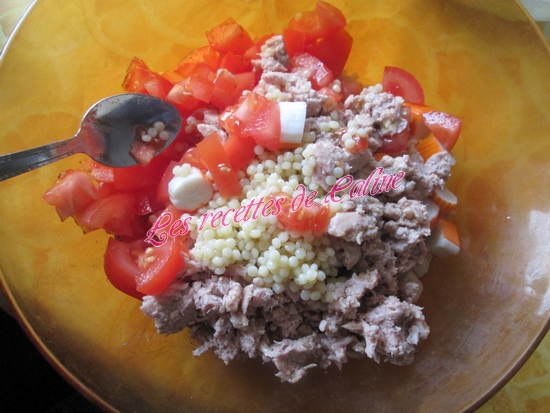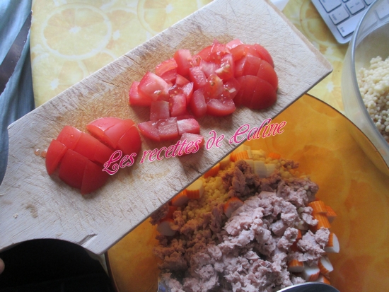 Couper les tomates en dés et les mettre dans le saladier avec le reste, bien mélanger.