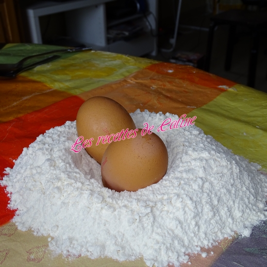 Verser la farine sur votre plan de travail, puis faire un puits et y mettre les oeufs entier.