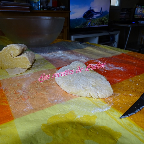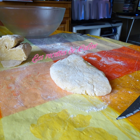 Fariner votre plan de travail, et pétrir à nouveau la pâte faire un boudin et divisez-la en 5 pâtons (2 pâtons pour ma part, vu que j’ai diminué les quantités).