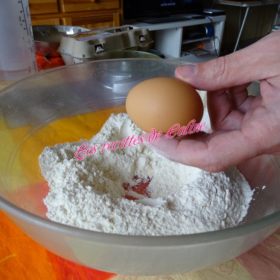 Verser la farine et le sel dans un récipient. Casser l‘œuf par dessus.