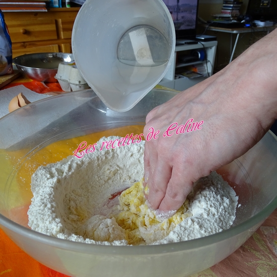 Tout en mélangeant, verser de l’eau au fur et à mesure ** (si vous souhaitez colorer vos pâtes c’est maintenant qu’il faut le faire)