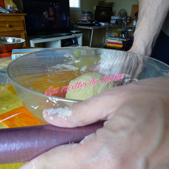 Former une boule de pâte. Puis bien la pétrir pour la rendre souple et lisse. Puis, couvrir d‘un film étirable et laisser reposer 30 min.