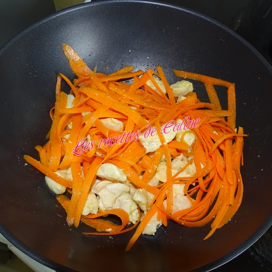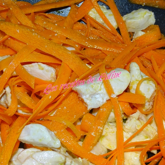 Ajoutez l’ail et les carotte, faites sauter 3 min puis couvrez et laissez cuire 5 min à 8 min à feu doux (goûtez pour voir si les carottes sont cuites, sinon prolongez un peu la cuisson, chez nous on les aime encore un peu croquante).