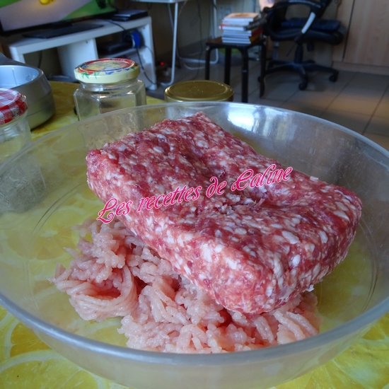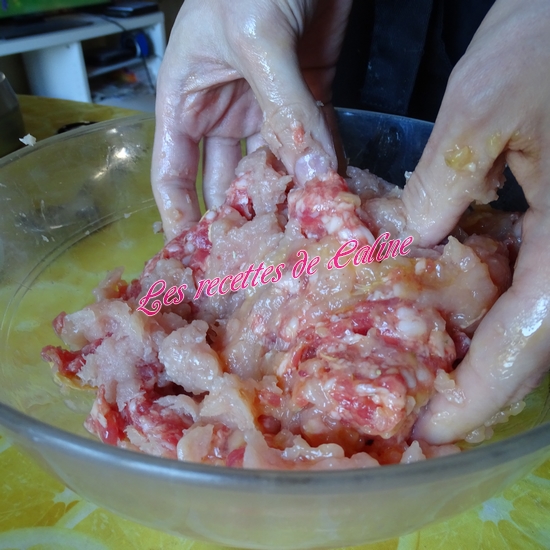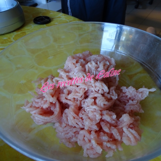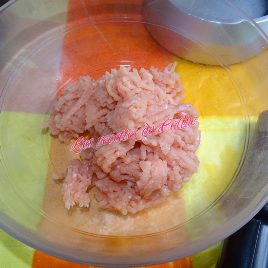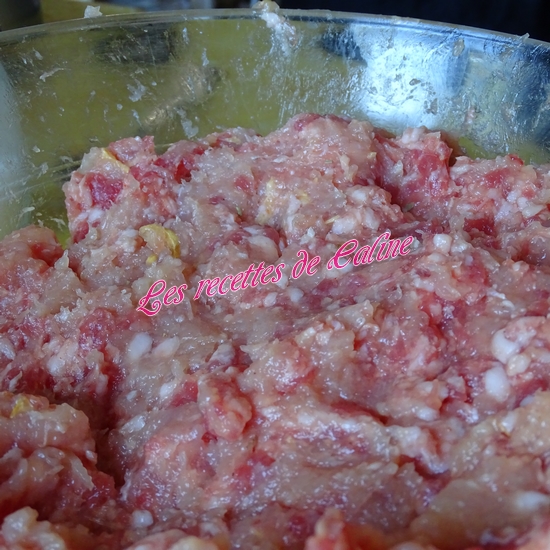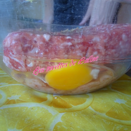 Mélangez la chair à saucisse, le poulet haché, l’oeuf, l’oignon, le sel et le poivre dans un récipient.