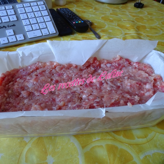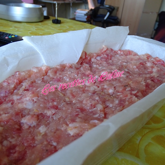 Placez la préparation dans une terrine en tassant bien (pour ma part, j’ai chemisé mon moule car la chair à saucisse rend quand même beaucoup de gras, donc en mettant du papier cuisson dans le moule c’est plus simple pour le démoulage ensuite)