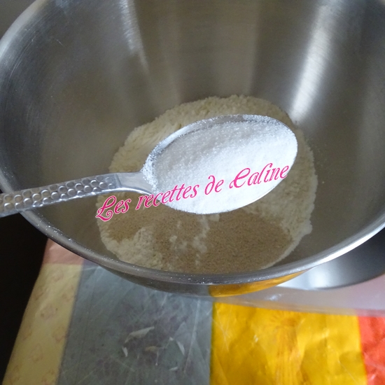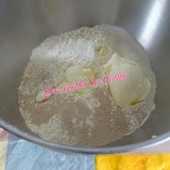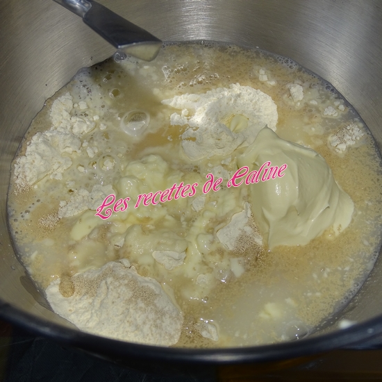 Mélangez au robot (ou à la main), la farine le sucre, le sel, la crème fraîche et la levure boulangère.