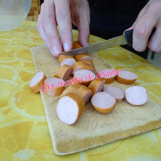Coupez les saucisses en rondelles et ajoutez-les aux tomates.