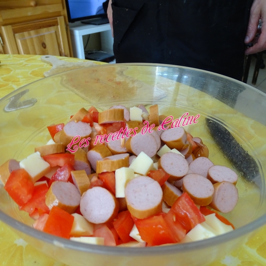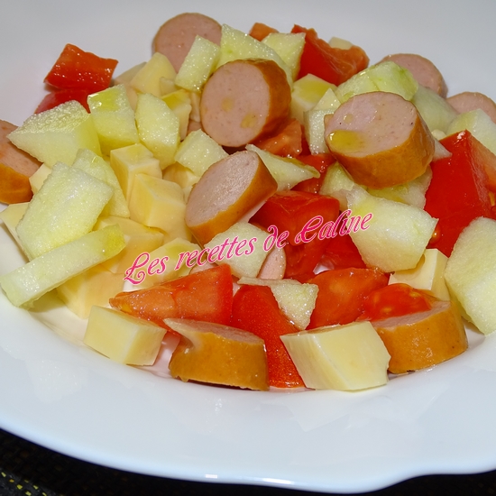 Mettre les cubes de pommes dans le fond des assiettes et ajouter par dessus le reste de préparation (saucisse/tomates/emmental)salé, poivré, puis arrosez de jus de citron et d’une cuil à soupe d’huile d’olive par assiette