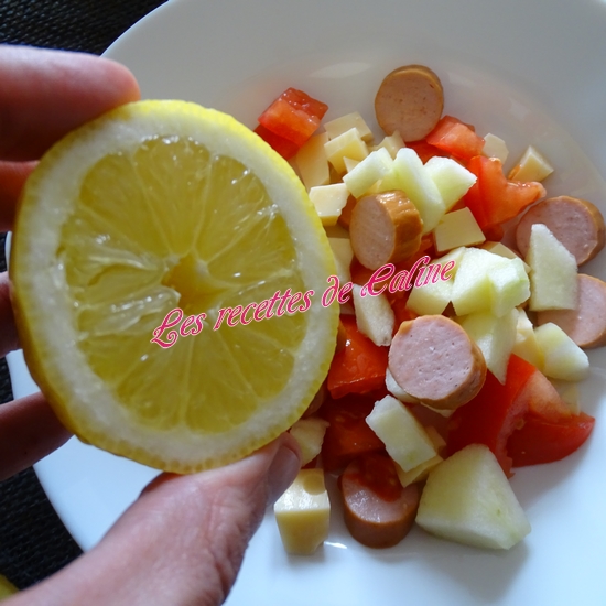 Mettre les cubes de pommes dans le fond des assiettes et ajouter par dessus le reste de préparation (saucisse/tomates/emmental)salé, poivré, puis arrosez de jus de citron et d’une cuil à soupe d’huile d’olive par assiette