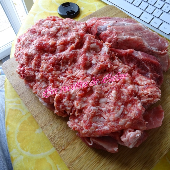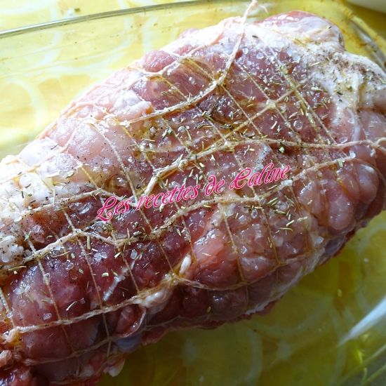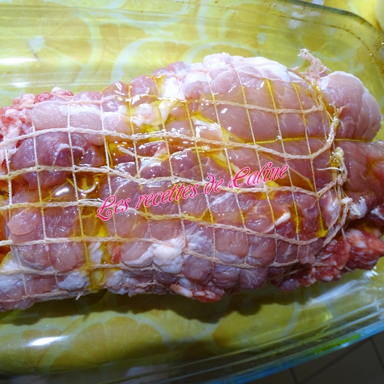 Farcissez-le de chair à saucisse. Ficelez-le (ou faire repasser l’élastique autour du rôti, pour ma part, je l’ai ficelé et j’ai remis l’élastique) et déposez-les dans un plat à four.