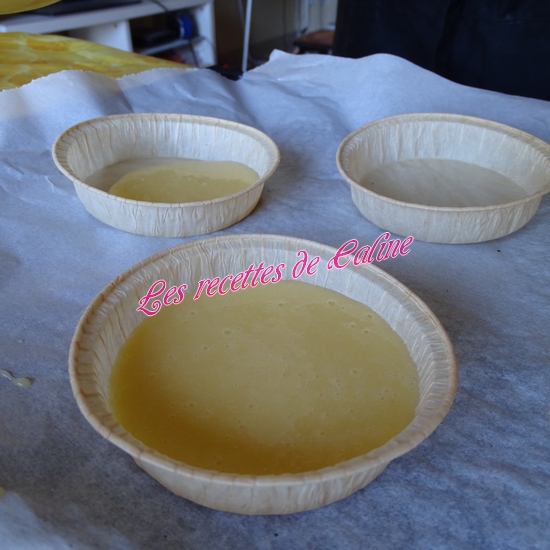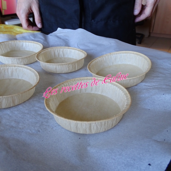 Mettre une feuille de papier sulfurisé au fond d’un moule à tarte, verser la préparation et enfourner 15 à 18 min à 180° en surveillant bien la cuisson.(pour ma part, je ne mets pas de papier cuisson vu que j’utilise des moules en papier cuisson )