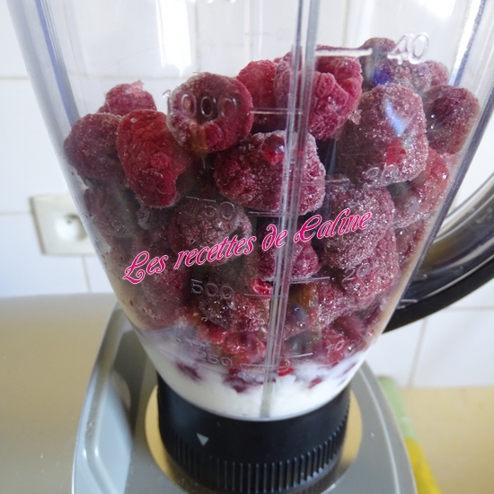 Mettez les framboises encore surgelés dans le blender et incorporez les yaourts brassés puis le sucre glace. (En fonction de vos goûts, vous pouvez ne pas mettre de sucre glace).