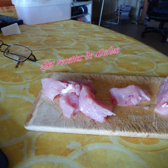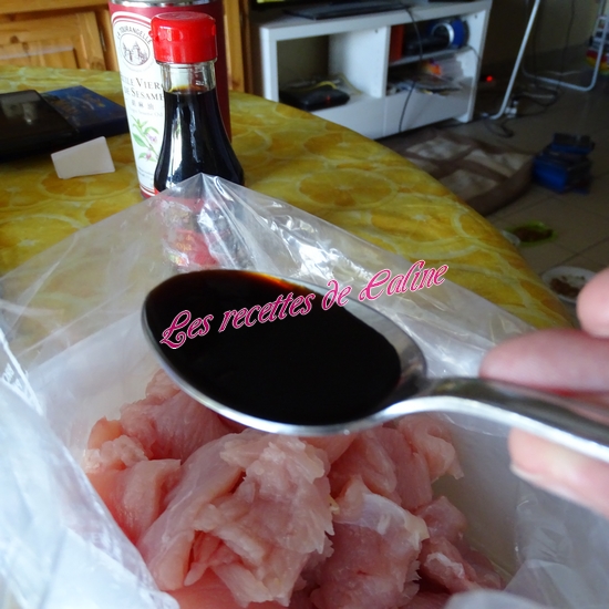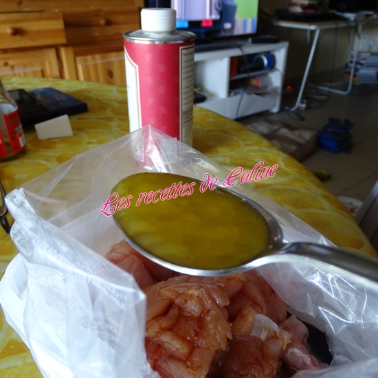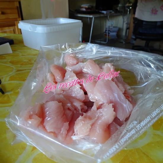 Dans un saladier (ou sac congélation), mettre les morceaux de poulet et le reste des ingrédients.