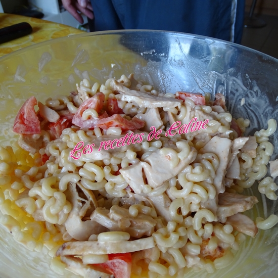 Versez les pâtes dans un saladier. Coupez la tomates en petits cubes, et l’ajouter aux pâtes