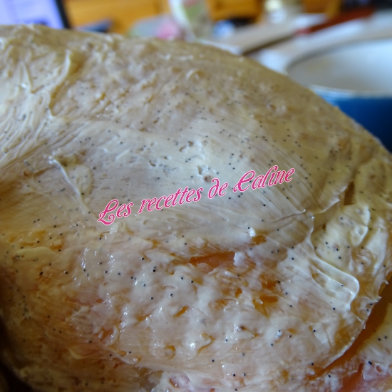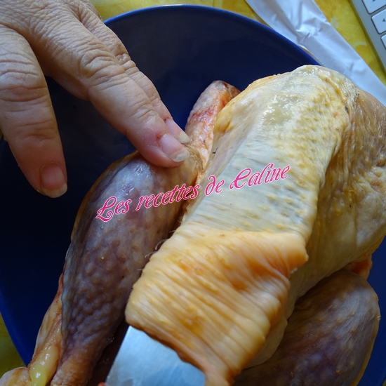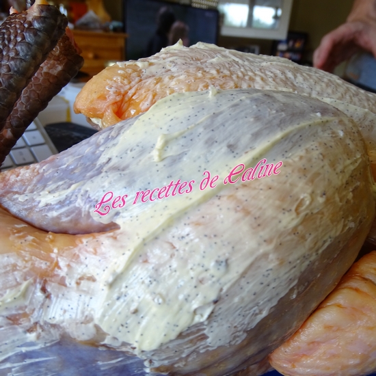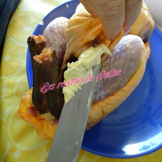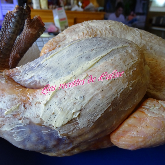 Préparer la pintade, décoller doucement la peau du ventre (avec le manche d’une grande cuillère ou une spatule a bout rond, pour ne pas percé la peau de la viande) et placer une noix de beurre vanillé sur chaque blanc, malaxer afin d’étaler le beurre sur les blancs.